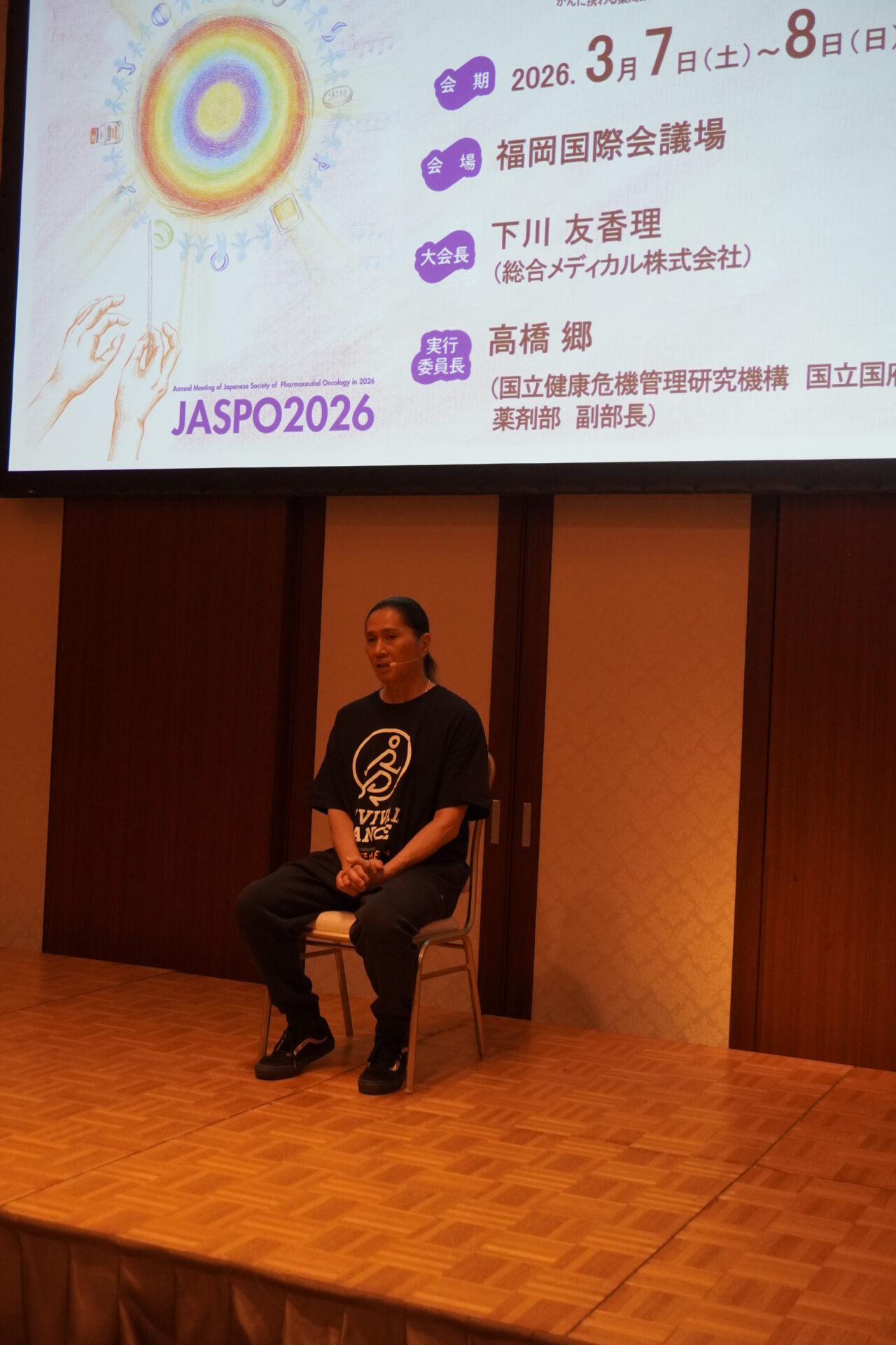 大会2日目には、福岡サンパレスにて市民公開講座「心と体を元気にする体力づくり」を開催いたしました。第一部では専門医・薬剤師が「がんに負けないカラダ作り」をテーマに、ロコモ対策や骨の健康維持について講演。第二部ではTRFのSAM氏をゲストに迎え、自宅で無理なく取り組める「リバイバルダンス」のレクチャーを実施しました。会場では薬剤師による相談ブース「教えて!薬剤師さん」も設置され、専門知識を地域の皆様へ還元する場となりました。